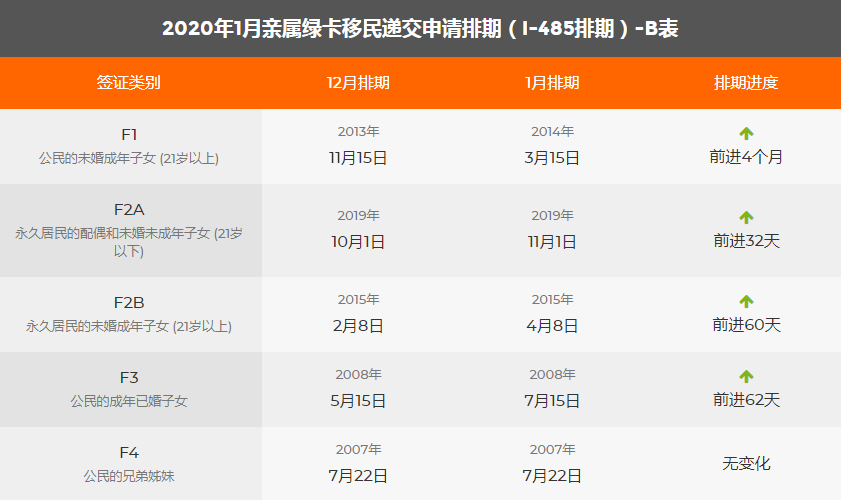 國務院公布的2020年1月綠卡移民排期公布,親屬移民穩步前進,職業移民前進緩慢,其中EB3前進一個月,幅度最大。
