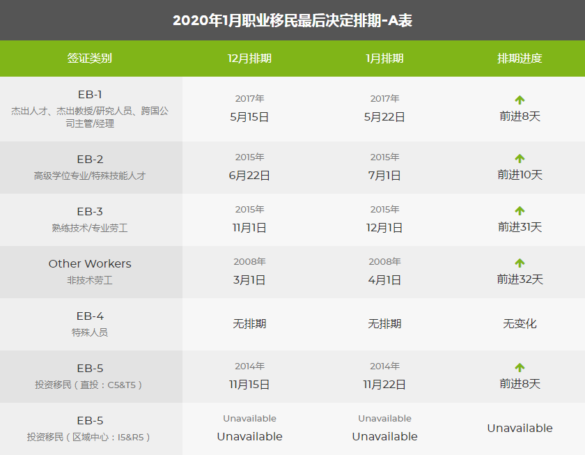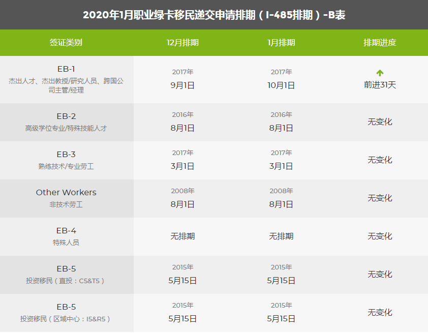 EB3 前進一個月!除了中國大陸出生、印度、墨西哥、菲律賓之表列國家之外,全球/港澳臺申請者職業移民2020的1月部分類型也有排期,EB1 排期2018年10月1日,EB2 和 EB3 沒有排期。