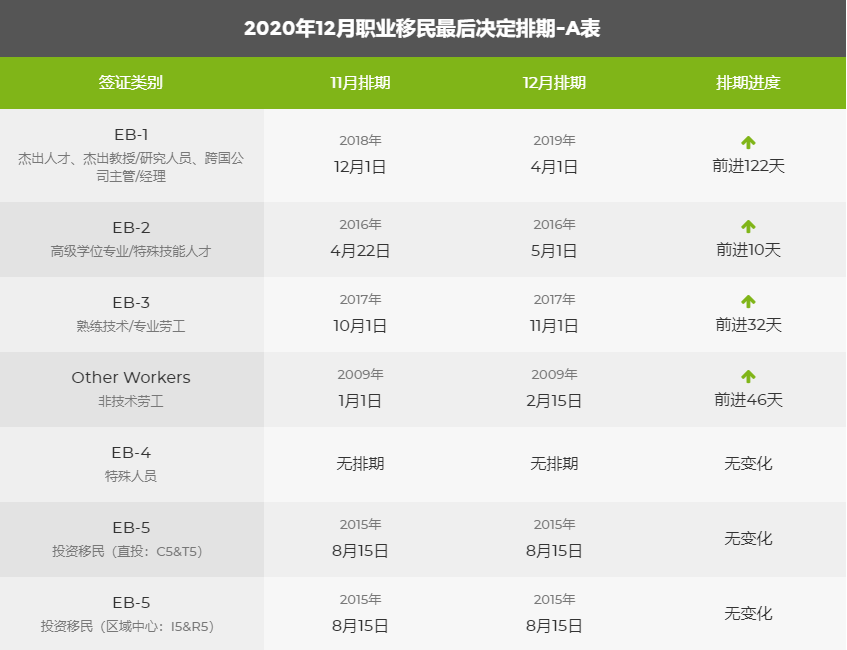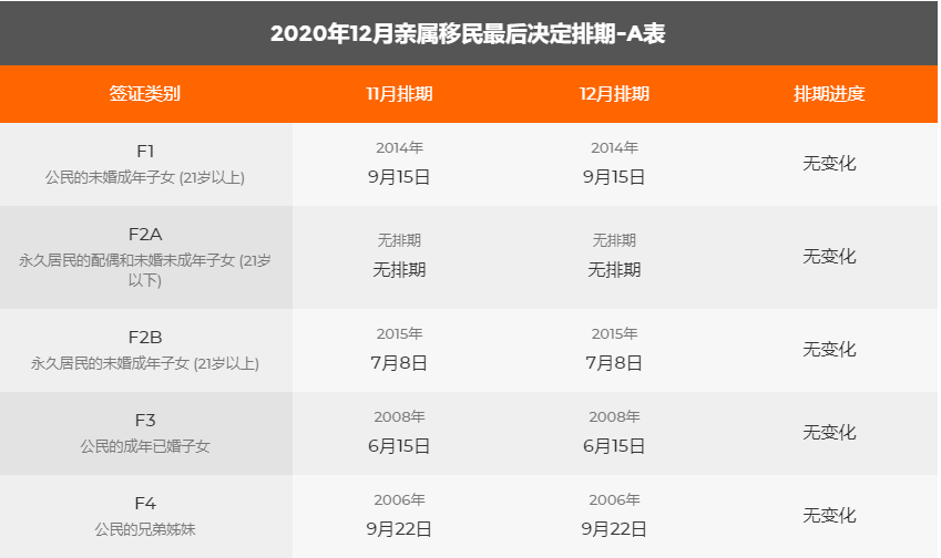 這兩天國務院公布了2020年12月綠卡移民排期,情況跟上個月基本相似,親屬移民完全停滯,職業移民各種類型均有前進。以下是幾個重點: