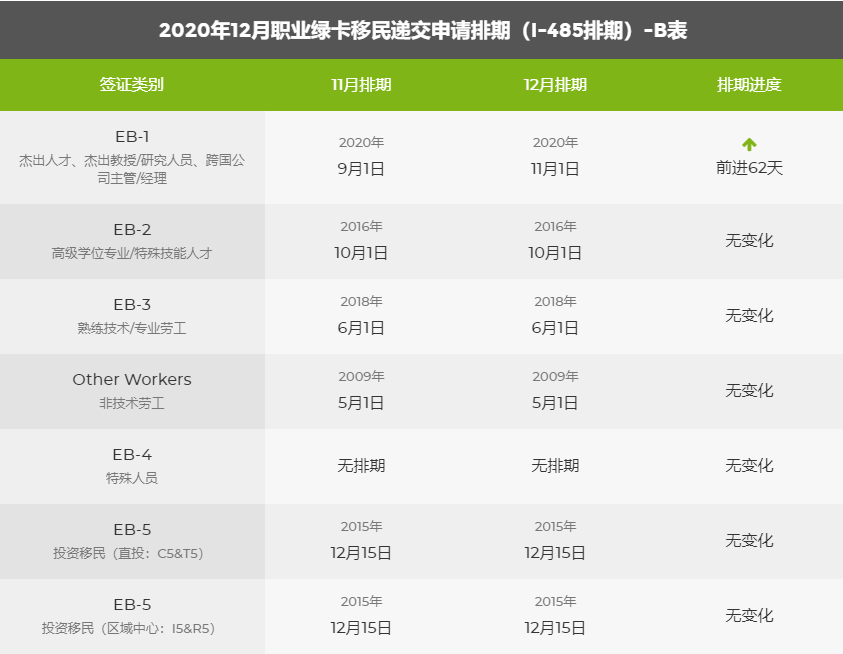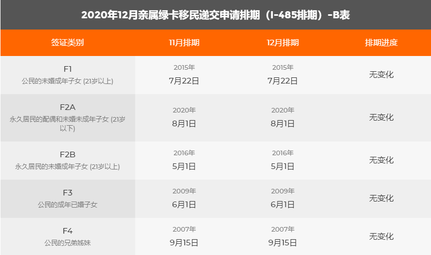 可簡稱「遞件排期」,意指申請人最早可以提交綠卡申請表(I-485)的日期,其進度明顯快于表A。