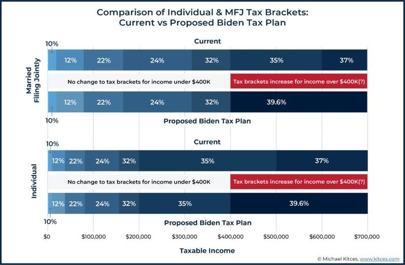 拜登稅改計劃里提出將個人所得稅最高稅率從現在的37%提高到39.6%,同時承諾,不會對任何年薪少于$40萬美元的人士加稅。不過他的計劃里也沒有詳細說,到底這個$40萬的分界線只是個人收入?還是家庭收入?所以不要著急,等具體政策出來后就知道了~