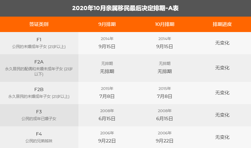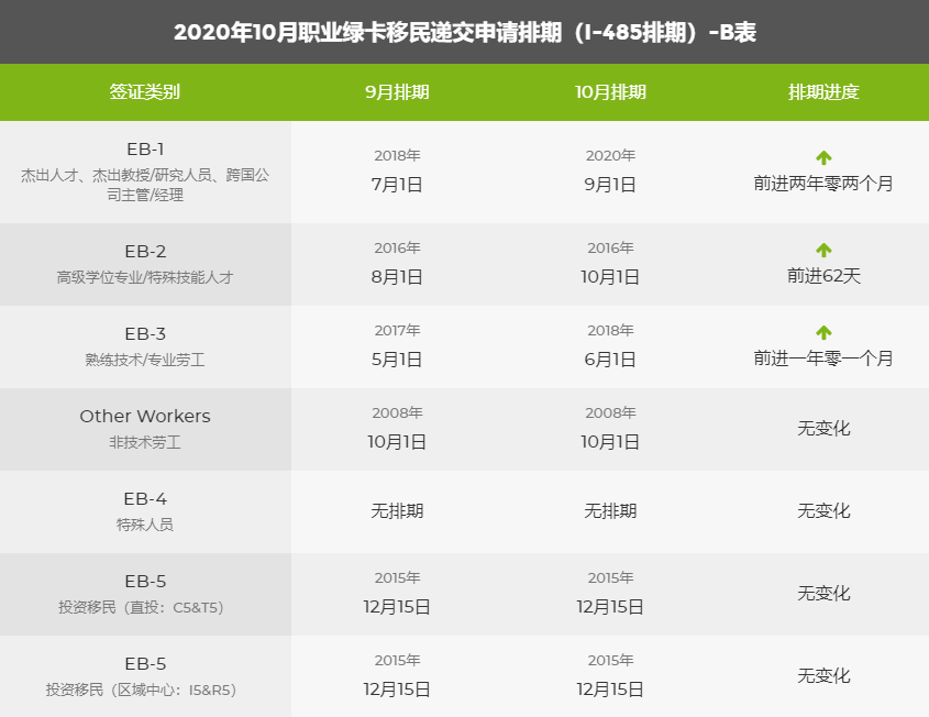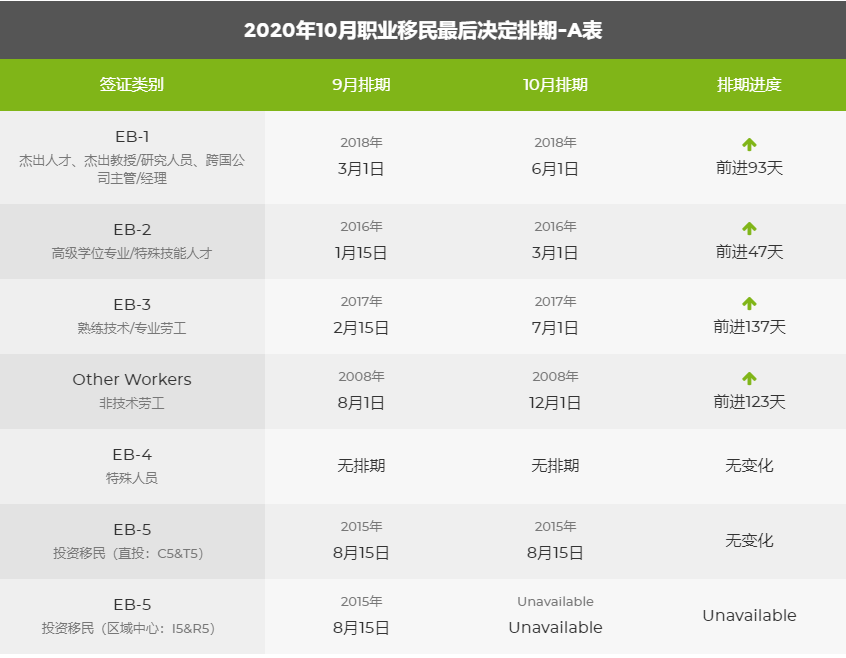 近日,國務院公布了2020年10月綠卡移民排期表,通過排期表我們發現,親屬移民處于停滯的狀態,反觀職業移民各種類型都有大幅前進。以下便為大家整理的幾個重點。
