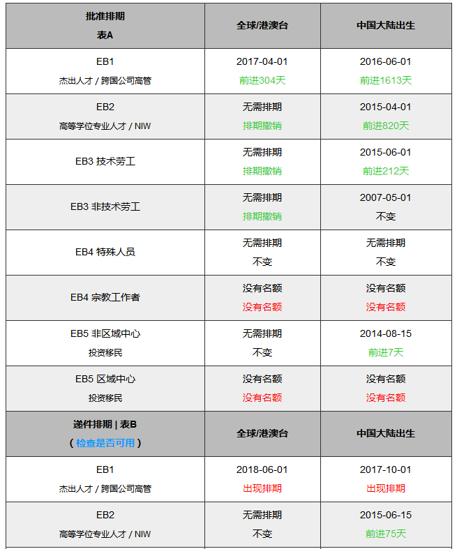 批準排期(Application Final Action Dates):指有簽證名額的排期,也稱表 A。