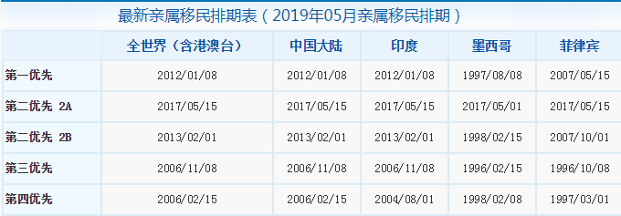 2019年5月親屬移民排期表: