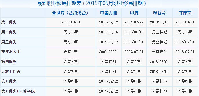 2019年5月職業移民及親屬移民排期表詳解