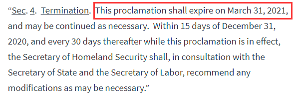 美國當(dāng)?shù)貢r(shí)間2020年12月31日,美國總統(tǒng)特朗普宣布將移民和工作簽證禁令延長3個(gè)月(具體解除時(shí)間以總統(tǒng)令為準(zhǔn)),從而使得這一禁令將在拜登就任后繼續(xù)生效。特朗普表示,外國勞動(dòng)力進(jìn)入美國國內(nèi)市場(chǎng)有損美國的根本利益,簽證禁令保護(hù)了美國本土工人。