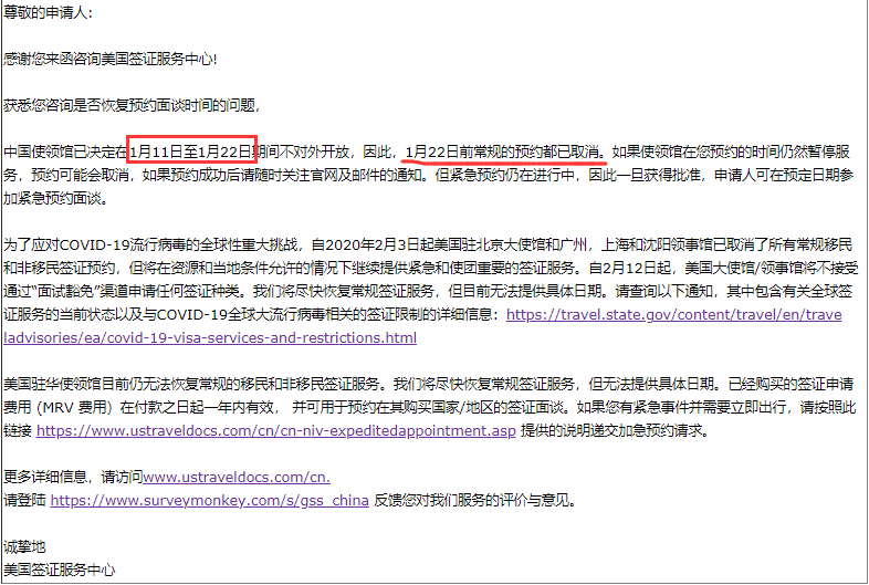 而近日,中國使領(lǐng)館也表示在1月11日至1月22日期間都不對(duì)外開放,1月22日前常規(guī)的預(yù)約都已取消。看來只有疫情有效控制或者結(jié)束,美國簽證才能再次開放!
